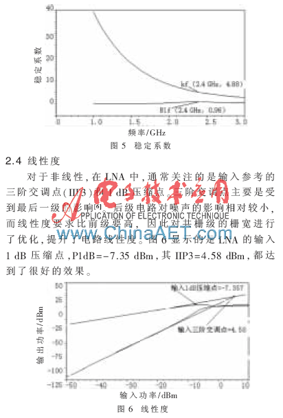射频电路的设计过程中,在工作频段内,放大器应处于绝对稳定状态。一旦放大器处于非稳定状态,则有可能使得整个电路无法正常工作,导致其后的设计都无法进行。从图5中可知,放大器电路在整个工作频率范围内十分稳定。