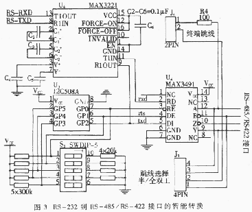 该智能转换器必须解决两个关键问题,即如何从RS-232线上获得电源和RS-485RS-422接口驱动所需的功率,和如何智能控制RS-485RS-422的收发使能。