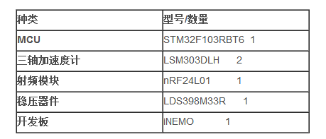 手部系统包括iNEMO、射频模块、传感器模块、电源模块和防丢失模块。其中传感器模块为两个LSM303DLH三轴加速度计,用于采集加速度信号;MCU为iNEMO开发板MCU(STM32F103RET7);传感器信号经由MCU处理、编码后通过nRF24L01发送到受控端PC端系统;电源模块为两块3V纽扣电池,接入iNEMO用其内部稳定芯片转换3V3、1V8电压;找回模块含LED和扬声器,提供找回功能。