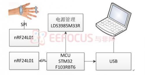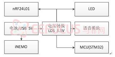 图示系统分为两个大模块:手部模块和PC端模块。其中手部模块含动作感应(iNEMO及三轴加速度计)、电源、无线发送和防丢失模块;PC端模块含主MCU、无线接收装置、USB等模块。