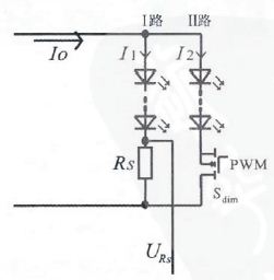 (2)第二种调光方案:将LED并联两路,一路用模拟调光,一路用PWM 调光。两路调光示意图如图7 所示。Ⅰ路和Ⅱ路的输出电压都为Uo,则Ⅰ路通过模拟方式进行调光;Ⅱ路的Im即在电压Uo下的电流值,通过改变占空比改变流过Ⅱ路的电流,进行调光。若两路带的负载一样, 则Io=I1+I2≈(1+D)I1。