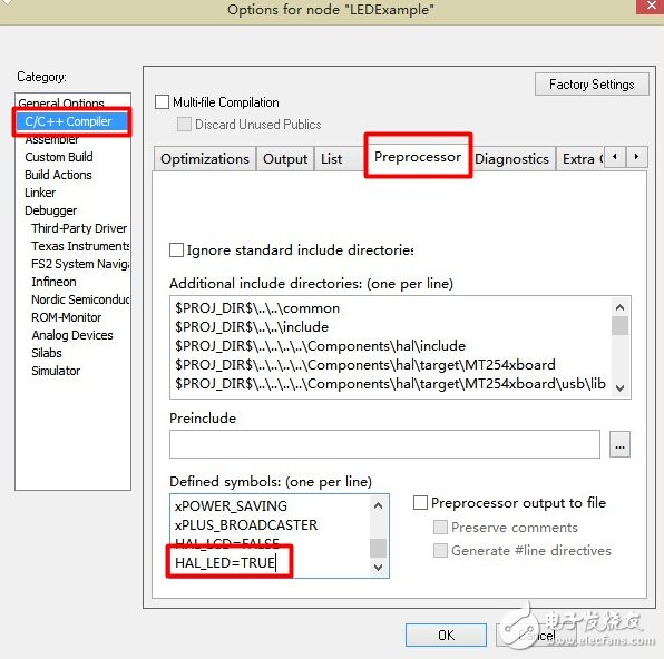 从这里可以看到(类似的地方有很多),如果要使能按键功能还需要定义CC2540_MINIDK,但是阅读整个协议栈你会发现,定义 CC2540_MINIDK后还会打开其它的功能,而那些功能并不是我们想要的,所以在这里我们使用另外一种方法来实现。我们定义我们的开发板也能使用按键功能,所以在工程配置中添加MT254xboard=TRUE,然后在按键功能有宏开关的地方加入这个条件。具体位置参见代码。
