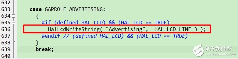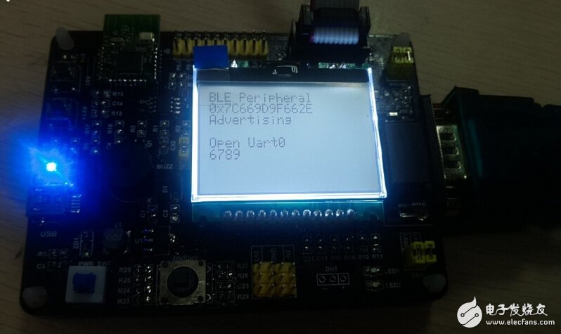 在事件回调函数中可以看到这里将本机地址显示到第二行,将字符串Initialized显示到第三行,但是为什么我们在第三行没有看到这行字符串呢?而显示的字符串是Advertising ,这是因为系统启动后运行非常快,在我们还没反应过来的时候已经进入了广播状态,并且将原来的字符串覆盖了,所以我们最后只能看到Advertising 了。