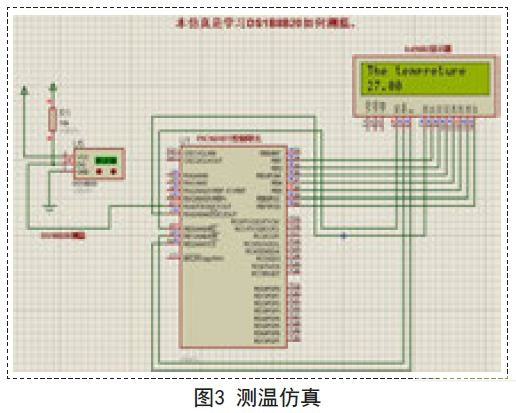 在仿真调试的过程中,先后对DS18B20测温模块、lcd1602显示模块、PIC单片机的USART模块通信等,分别进行了仿真测试。待各部分均测试正确无误后,方才对整体电路进行测试。图3所示即为本文对温度测量部分进行仿真调试和测试。