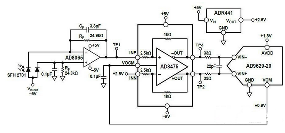 如图所示电路是一个高速光电二极管信号调理电路,具有暗电流补偿功能。系统转换来自高速硅PIN光电二极管的电流,并驱动20 MSPS模数转换器(ADC)的输入。该器件组合可提供400 nm至1050 nm的频谱敏感度和49 nA的光电流敏感度、91 dB的动态范围以及2 MHz的带宽。信号调理电路采用±5 V电源供电,功耗仅为40 mA,适合便携式高速、高分辨率光强度应用,如脉搏血氧仪。