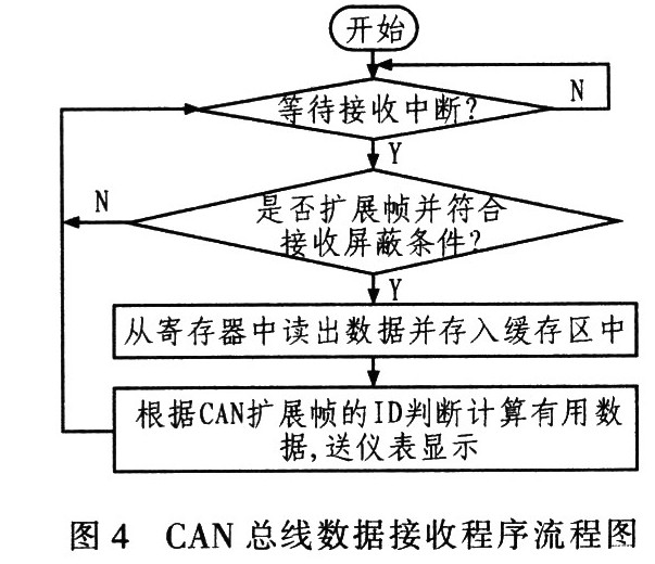 初始化后,读取CAN总线和其他传感器信号。控制步进电机和液晶屏显示处理数据。等待CAN总线接收中断产生,判断总线数据是否满足屏蔽条件,即逐位比较接收的29位标识符报文与验收码、屏蔽码值,屏蔽码用于定位相关位(0=相关,1=不相关)。只有标识符中的相关位与验收码相应位相同,系统才接收报文。如满足屏蔽条件则从寄存器读取数据并存入缓存区,再根据SAEJ1939协议判断计算发动机转速、水温和故障代码信息,传输至步进电机和液晶屏显示。例如:接收的数据为:OCF00400XXXXXX4F55XXXXXX(XX为任意数据),若设置验收码为Ox00000000,屏蔽码为0xlFFFFFFF,则接收该报文。根据SAEJl939-71协议,此报文为:PGN61444一电子发动机控制器。因此,可得第4,5字节为发动机转速,并遵循低位在前,高位在后的传输方式,则发动机转速=原始数×分辨率+偏移量=21831x0.125+0=2728.875r/m。同理可计算其他汽车仪表所需数值。图4为CAN总线数据接收程序流程图。
