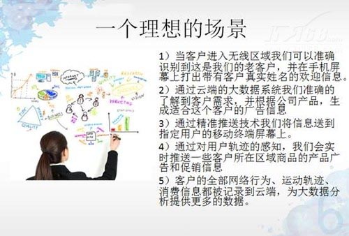 移动终端记载了一个人的全部数据,但由于在商业WiFi模式下,由于是商家提供的免费WiFi网络,那么商家就找到了接触这些信息的机会,利用大数据技术给了商家利用这些信息能力框架,进行大数据营销,定向精准信息推送给了商家做个性化推荐的能力,从此商业无线,成为了竞相抢滩的兵家必争之地。