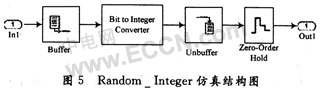 该模块采用Communications Blockset工具箱设计完成,其仿真结构如图5所示。参数设置为4,即每4位二进制转化成为1位十六进制,输出幅值在[1,15]之间、码持续时间为1 s的随机整数序列。