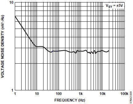对于20kHz的带宽,该乘数因子为141。举ADA4075-2为例,其噪声密度为2.8 nV/√Hz乘以141,因此噪声电平为0.395μV或-128 dBV。运算放大器的噪声密度通常在数据手册的典型特性部分的表格中显示,且通常显示其整个频率范围内的曲线。该图表可用于查看在何频率下运算放大器噪声将取决于1/f噪声。对于许多运算放大器来说,这个点通常低于音频频带(20Hz)低端,但是噪声密度的曲线仍然值得一看,且不能仅参考噪声密度指数来完全描述噪声性能。图1为ADA4075-2数据手册中的噪声密度图实例。请注意图1中1/f转折点约为10Hz,远低于MEMS麦克风前置放大器电路的目标频带。