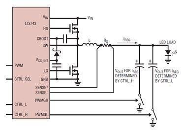 通过把准确的模拟调光 (高光度状态和低光度状态) 与 PWM 调光组合起来,实现了精准、宽范围的 LED 电流控制。模拟调光通过 CTRL_L、CTRL_H 和 CTRL_T 引脚来控制;PWM 调光则通过 PWM 和 CTRL_SEL 引脚来控制。通过采用在外部进行开关操作的负载电容器这种独特的做法,LT3743 实现了高和低模拟状态之间的快速变换,从而能够在几 μs 的时间内改变已调 LED 电流水平。开关频率可以在 200kHz 至 1MHz 的范围内进行设置 (通过采用一个外部电阻器) 和同步至一个频率范围为300kHz 至1MHz 的外部时钟。
