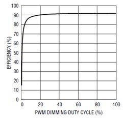 LT3743 适应任何传统的 PWM 调光方法。同类竞争 LED 驱动器所采用的并联输出调光会造成能量的浪费,而且在 LED 占空比低于约 50% 时效率欠佳。由于 LT3743 具有两种电流调节水平,因此当分路被占用时已调电流可下降至零。即使在低 LED 占空比条件下,这也能提供出色的效率。