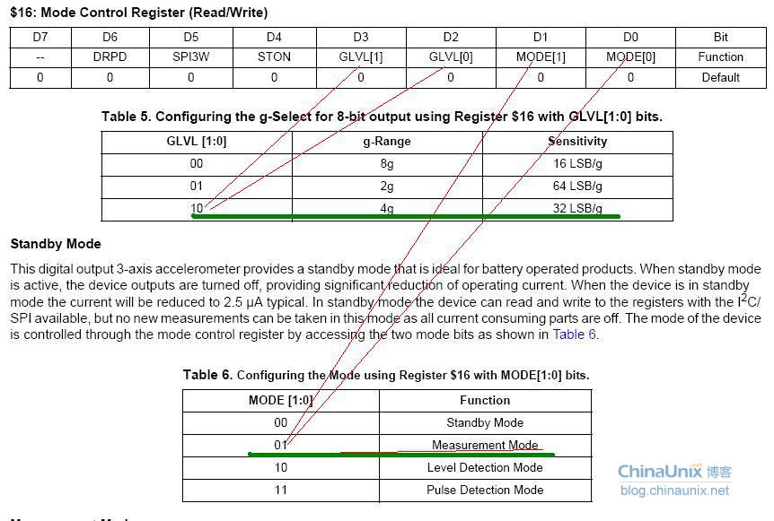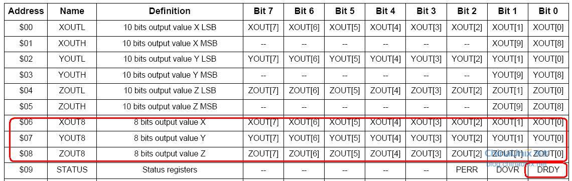 地址为06-08的寄存器保存的就是XYZ轴的加速度数值,可以同过IIC读出来,然后利用灵敏度转化为实际的加速度数值。那个DRDY是数值转换完成状态位,在读取数值前,要检测该位,只有它为1的时候,说明数据转换完成,可以读取。