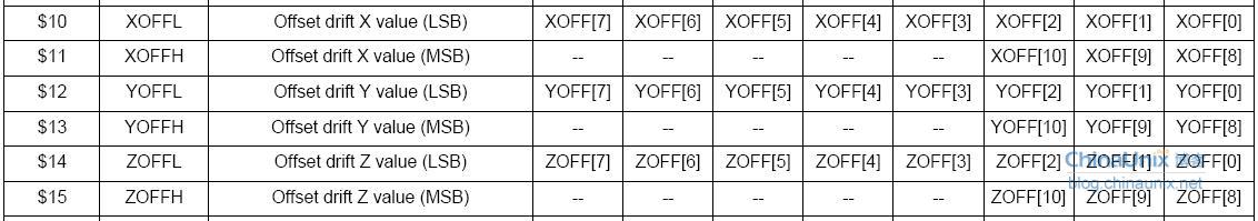 因为这个芯片是利用变化的电容来检测加速度的,所以有个初始值的误差,需要校正,校正寄存器是下图,
