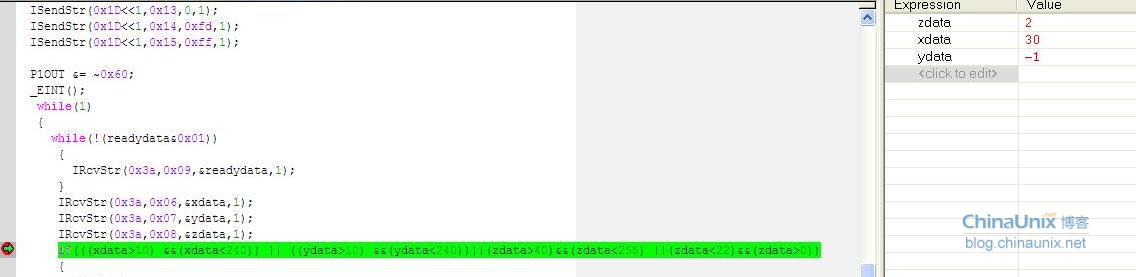 这里调用的函数都是IIC函数,不多说了了,就这样结束吧。下面传几张,我断点调试的图,显示XYZ轴的数据,原始的数据,也就是06-08寄存器的数据。至于是怎么放置的,我想你看看XYZ轴的数据就会明白了吧。