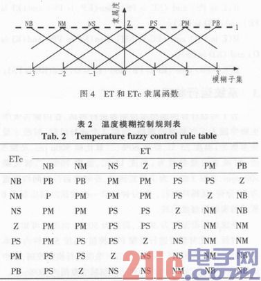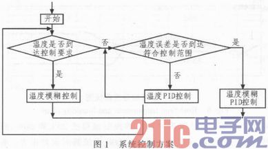 3)温度控制除了涉及精度、干扰等问题,同时还有时段跳转时的平滑快速控制问题,因此用模糊控制与模糊PID控制分时复用的方法对温度进行控制。用模糊控制的快速适应性实现平滑快速的控制,用模糊PID控制实现强抗干扰性的精确控制。