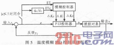 温度控制器器结构上分为两部分,模糊控制部分和模糊PID控制部分。