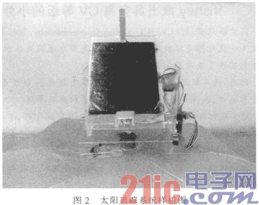 太阳追踪系统由控制模块、检测模块、执行模块3部分组成。其中,控制模块主要包括STC89C52单片机组成的中央处理器;检测模块主要由遮光器配合下的光电传感器、位置传感器及其外围电路构成;执行模块主要包括步进电机、驱动电路。其总体结构如图1所示,其样机如图2所示。