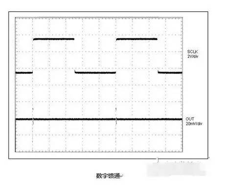 数字馈通是指DAC数字控制信号变化时,在DAC输出端产生的噪声。在下图中,DAC输出端的馈通是串行时钟信号噪声的结果。