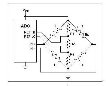 施加至ADC电压基准输入的电压不是恒定电压,而是与施加至变送器(即负载单元或电桥)的信号成比例。这种类型的测量称为比例测量,它消除了基准电压变化引起的所有误差。下图中使用电阻桥的方法就是比例测量的一个例子。