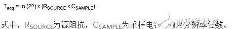 采集时间是从释放保持状态(由采样-保持输入电路执行)到采样电容电压稳定至新输入值的1 LSB范围之内所需要的时间。采集时间(Tacq)的公式如下: