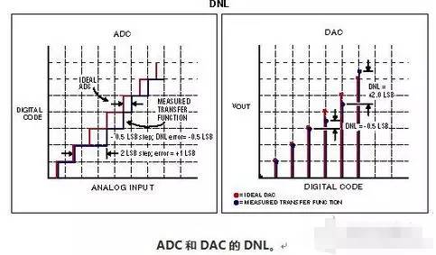 对于ADC,触发任意两个连续输出编码的模拟输入电平之差应为1 LSB (DNL = 0),实际电平差相对于1 LSB的偏差被定义为DNL。对于DAC,DNL误差为连续DAC编码的理想与实测输出响应之差。理想DAC响应的模拟输出值应严格相差一个编码 (LSB)(DNL = 0)。(DNL指标大于或等于1LSB保证单调性。)(见“单调”。)
