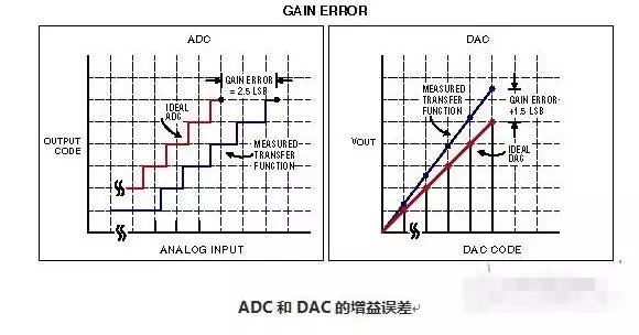 ADC或DAC的增益误差表示实际传递函数的斜率与理想传递函数的斜率的匹配程度。增益误差通常表示为LSB或满幅范围的百分比(%FSR),可通过硬件或软件校准进行消除。增益误差等于满幅误差减去失调误差。
