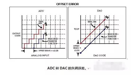 失调误差常称为“零幅”误差,指在某个工作点,实际传递函数与理想传递函数的差异。对于理想数据转换器,第一次跳变发生在零点以上0.5LSB处。对于ADC,向模拟输入端施加零幅电压并增加,直到发生第一次跳变;对于DAC,失调误差为输入编码为全0时的模拟输出。