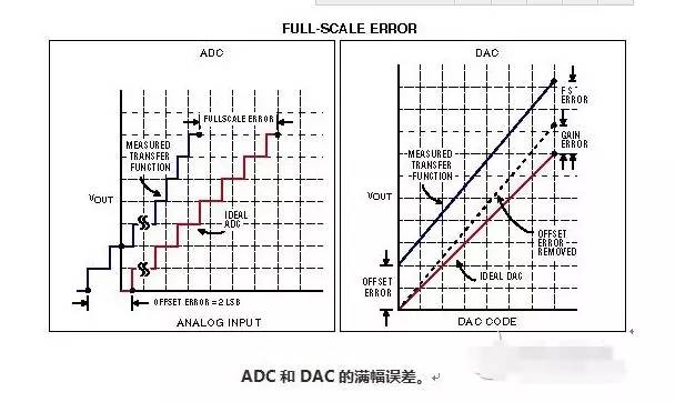 满幅误差为触发跳变至满幅编码的实际值与理想模拟满幅跳变值之差。满幅误差等于“失调误差+增益误差”,如下图所示。