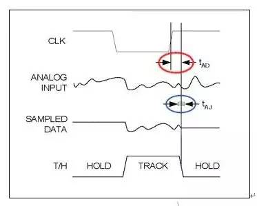 ADC中的孔径延迟(tAD)是从时钟信号的采样沿(下图中为时钟信号的上升沿)到发生采样时之间的时间间隔。当ADC的跟踪-保持切换到保持状态时,进行采样。