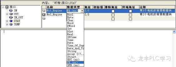 其次,需要在FB10中指定其所包含的背景数据块。方法如下:在FB10局部变量定义窗口中,在“STAT”变量区中(必须在此变量区中)为每台电机的控制取好名称后,数据类型选择FB <nr>,确认后,再把<nr>改为1,即功能块FB1。如果你在变量表中已经定义了FB1的符号,则会自动出现其符号名。地址一般由CPU根据FB1的接口参数数量自动计算得到,采用默认值就可以了。
