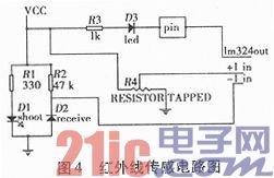 本系统共设计三个红外线传感器,分别放置在电动车的左、中、右三个方向,用来读取地上的黑色轨迹线。当行车方向偏离轨迹的时候,通过这三个红外线感应装置就可以判断出行车偏离的方向,将实时信息以高低电平的方式传送回单片机,然后通过单片机的处理,相应的控制直流芯片就可以修正行车路线,最终完成自动寻迹的任务。红外线传感器的工作过程如下:当行车方向向右偏离轨迹线的时候,会有两种情况发生:1)中间和左侧红外线传感器同时接触到地面黑线,右侧传感器接触白色地面;2)左侧一个传感器接触黑线,中间和右侧传感器接触地面白色部分。这两种情况都是行车方向右偏移的情况。相似的小车发生左偏移的时候也有两种情况。这三个传感器作为行车数据的输入信号由单片机的I/O口输入,那么就需要一个TFL的电压,而且要根据需求可以对传感器的灵敏度进行微调,满足灵敏度的需要。所以可以把这三路信号引入由LM324组成的电压比较器进行电平的整形,最终给单片机使用。