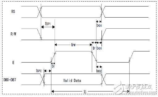 P2.0,P2.1,P2.2分别是RS,R/W和E三个控制位,P0.0-P0.7是8位数据线。三个控制位详见说明,RS=0表示写或读指令,RS=1表示写数据。R/W是读写指令,R/W=1是读,R/W=0是写。E是使能端,要根据时序图去写对应的程序,具体时序图如图3所示。