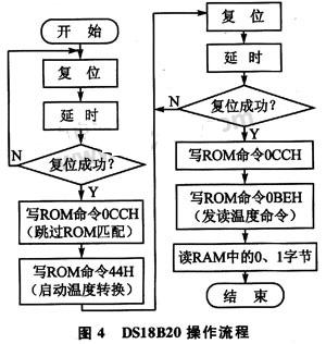 根据DS18B20的通信协议,MCU对其操作主要有如下3个步骤:读写之前,对DS18B20发送约500 μs的低电平进行复位;复位成功,发送ROM指令;发送RAM指令。MCU对DS18B20的具体操作流程如图4所示。