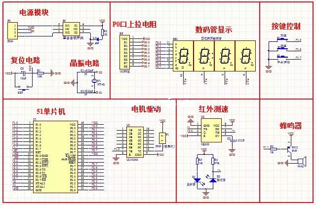 4 红外测速电路:发射管工作时发出红外线,当接收管收到红外信号时,其电阻变小(本设计相当于从无穷大变到1k左右)。利用其电阻变化,改变接收管分压情况。挡片是利用圆盘上剪四个孔,当挡片随电机转动时,接收管两端电平发生变化,产生脉冲。