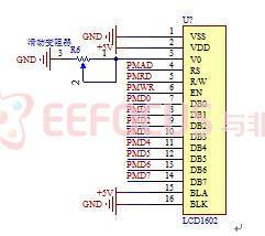液晶显示器对比度调整端,接正电源时对比度最弱,接地电源时对比度最高(对比度过高时会产生“鬼影”,使用时可以通过一个10K的电位器调整对比度)。