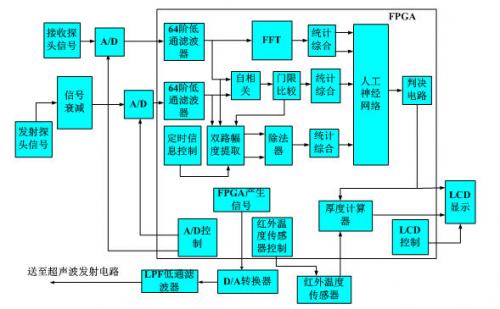 课题项目主要围绕如何对瓶体材料进行分类和以及如何测量瓶体厚度开展研究工作。超声波发射探头和超声波接收探头是该项目的主要传感器,完成对超声波的发送以及对回波的检测工作;之后对相关信号进行A/D转换,低通去噪处理;将经过去噪后的信号首先应用信号的自相关理论,从而精确提取出收发信号的延时情况;与此同时,我们还要通过FFT得到回波信号的频谱情况以及通过幅度提取模块获得收发信号的衰减信息;我们对得到回波频谱信息,收发信号延时情况,收发信号衰减情况进行统一的逻辑综合分析,得出人工神经网络的四点输入信息;利用得到的四点输入信息,我们采用人工神经网络算法,并通过离线学习构建出一个能够对瓶体材料进行分类的方法;最后我们可以完成一种可自动识别瓶体材质的瓶体测厚功能。