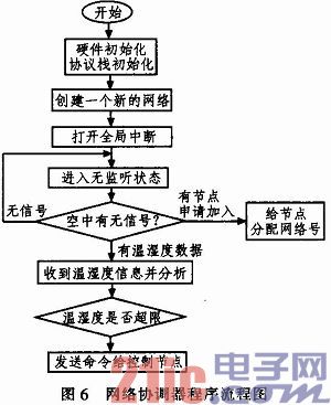 协调器主要负责网络的管理、汇聚采集的数据等,传感器测控数据通过网络无线节点的控制节点来控制是否启动变频调速控制空调、加湿机、除湿机和风机等机器设备。本系统采用星形拓扑网络实现通信,网络配置一个网络协调器和多个传感器节点,在网络中所有的传感器节点只与协调器通信。ZigBee网络由协调器发起并且建立。协调器首先进行信道扫描,采用一个其空闲的信道,规定一些相应的网络参数,协调器启动后,时刻监听空中无线信号,如果终端节点申请加入网络时,发出申请加入信号,并提供正确的认证信息,即可加入网络;如果监听到系统传感器采集节点发送的温湿度数据信息,协调器接收信息,并与系统设定值进行比较,如果温度和湿度超出了规定的上下限,协调器及时发出相应的命令给无线控制节点。协调器的软件流程如图6所示。