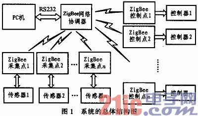 由于该系统面向SMT小型厂房设计,所以系统组网相对简单,数据的传输量也不大,因此采用只含有中心节点(协调器)和终端节点的星型网络拓扑结构就能够满足本系统的设计,完成数据和信息的正常通信。分布于上述监测区域的无线温湿度传感器节点,分为无线采集节点和无线控制节点两类,采集节点首先进行温度和湿度数据的采集、初步处理,然后通过ZigBee协议将从传感器节点接收的数据发送到协调器节点;协调器根据采集结果和系统设定值进行比较决定是启动无线控制节点来控制各种温湿度调节设备的运行状态,达到调节厂房中温湿度的目的;协调器节点本身还负责建立ZigBee网络,并发送和接收指令,通过RS232串口与监测中心PC机进行数据通信;监测中心PC机负责集中显示厂房各个监测区域的每个传感器节点采集到的温湿度信息,整个SMT厂房的无线监控系统的结构如图1所示。