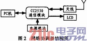 网络协调器作为无线传感网络的核心,实现网络无线采集节点的数据的收发和处理,并且能够通过并通过无线控制节点控制温湿度调节设备。协调器借助于RS232串口通信将数据发送到监测中心的PC机,实现整个系统监测信息的可视性。本系统的网络协调器由下列部分组成:CC2530通信模块、天线模块、LCD液晶显示模块和电源模块等构成。CC2530通信模块作为协调器的核心部分,承担着接收和存储传感器采集节点发来数据的任务,并且能够对数据进行分析处理,发送网络指令给无线控制节点,LCD显示网络节点工作状态;电源模块提供工作电压是3.3 V,为了确保协调器以及系统工作的稳定性,采用3.3 V稳压电源对核心芯片供电。网络协调器硬件结构图如图2所示。