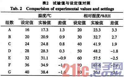 为了验证系统的实际应用性能,选取一块监控区域作为实验对象。首先,将该系统安置于SMT厂房的一个无尘密闭生产车间中进行试验。在试验过程中,开启车间的空气循环机,促进空气的流通和循环,尽量使得车间内空气的温度和湿度均匀分布。无线温湿度采集节点均匀的分布于车间的不同位置,避免采集节点集中放置带来的局部误差,以便能够准确的监测温湿度分布的信息。系统的控制节点连接的有变频调速器的空调可以调节温度,有增湿机和除湿机,可以进行湿度调节。系统全部安装完毕,开始试验。系统上电初始化,网络建立,系统开始工作,我们通过设定一系列不同的的温度标准和湿度标准,等待系统的调控工作完成后,将此时车间实际的温湿度信息记录下来,并且和设定的标准值进行比较,结果如表2所示。