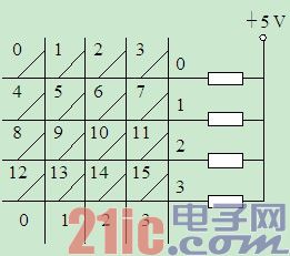 由图可知,一个4×4的行、列结构可以构成一个含有16个按键的键盘,显然,在按键数量较多时,矩阵式键盘较之独立式按键键盘要节省很多I/O口。