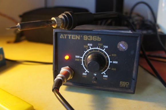 Step6:用300度温度的电焊挂一点点焊锡,小心的焊在芯片两个金属引脚上。注意,温度一定要控制好,不要长时间接触芯片金属引脚,否则很容易烧芯片!!