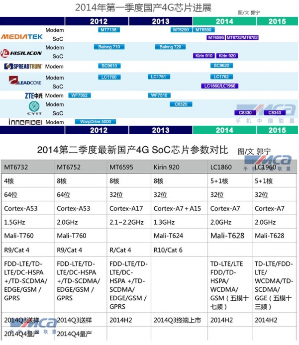 自从去年底4G TD-LTE正式发牌之后,对国产4G芯片影响很大,虽然中国移动的4G终端政策突然转向,而且还摇摆不定,但是各家的五模芯片,进展还是相当不错,其中,以联发科、海思和联芯最为突出。联发科用白菜价跟高通博时间,海思则是雾里看花全看第三方爆料,而联芯则是手机、平板等全线推进。整体来看,4G方面,高通仍然处于领军地位,不过国产厂商正在奋起直追。