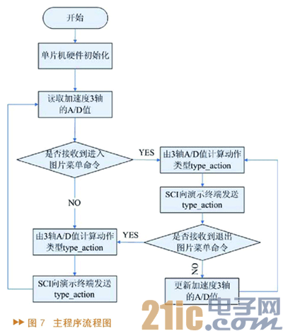 系统上电后,首先要对单片机的硬件系统进行初始化、配置寄存器等操作,之后才可以进行数据采集,将加速度的值进行A/D转换,得到量化的值。图片菜单是二级菜单,如果没有接到演示系统传给单片机进入二级菜单的指令,则单片机一直在主程序运行,不断地采集A/D值、进行动作判定,并向演示系统发送type_action的指令。演示系统可根据接收到的type_action的类型采取相应的动作。如果单片机接收到进入二级菜单的命令,则进入图片菜单,同时也执行类似于主程序的动作判定程序,并不断更新A/D采样值,发送type_action,直到接收到退出二级菜单指令才退出。下面详细介绍一下各个功能模块的具体设置。