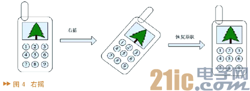 系统设计了六种动作,他们分别是左摇、右摇、下摇、上摇、图片左转、图片右转。图4中的图形象地说明了其中的两个动作,其它的动作与此类似。