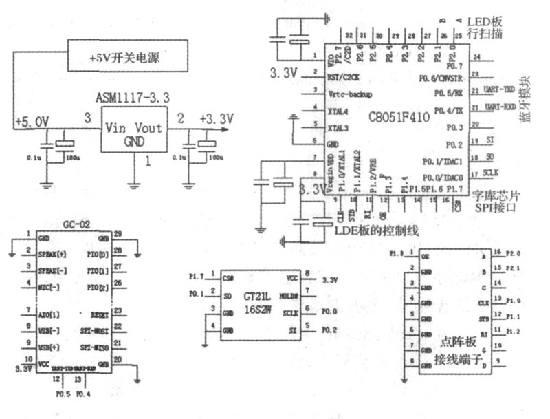 本系统以单片机C8051F410 作为MCU,外围电路包括蓝牙模块、字库芯片、LED 点阵屏和电源模块,系统电路原理如图8 所示。