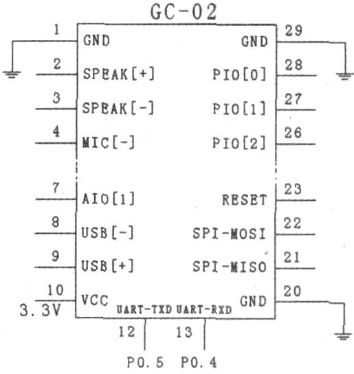 GC - 02 蓝牙模块共有29 个引脚,可通过SPI 接口或UART接口与单片机通信。本系统单片机选择UART 方式与GC - 02进行通信。蓝牙模块处于待机模式时,已配对过的手机向蓝牙模块发送文件,未配对的手机需先进行配对,输入正确的PIN 码( 即配对密码) 即可配对。此蓝牙模块的出场厂PIN 码是"1234",其PIN 码可通过向蓝牙模块发送指令进行修改。