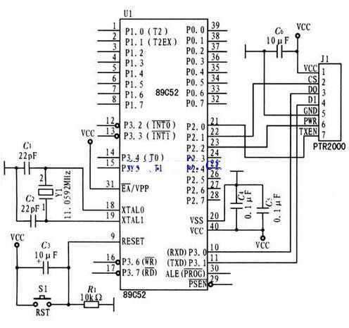 单片机的时钟电路和复位电路:单片机时钟电路设计中,选择晶振频率11.059 2 MHz,约定PC机和单片机的通信速率为9 600 b/s,并选择相应电容与单片机的时钟引脚相连构成时钟回路。在复位电路设计中,采用复位引脚和相应的电容、电阻构成复位电路。单片机与PTR2000接口原理电路如图所示。