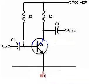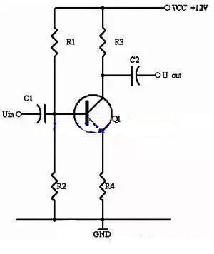 同理,当输入信号减小时,则Ib减小,Ic电流减小,则电阻R2的电压U2=Ic×R2会随之减小,Uce=VCC-U2,会变大。在输入信减 小时,Uce最大变化是从1/2的VCC变化到VCC。这样,在输入信号一定范围内发生正负变化时,Uce以1/2VCC为准的话就有一个对称的正负变化 范围,所以一般图1静态工作点的设置为Uce接近于电源电压的一半。