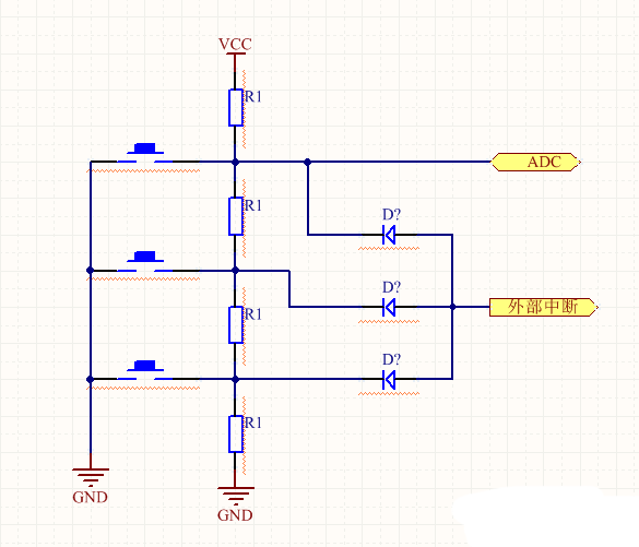改进二:在原有的ADC按键的基础上,也可用增加二极管的方式,实现按键中断,并在中断服务程序里进行AD转换,从而识别按键。电路如图1.6所示。